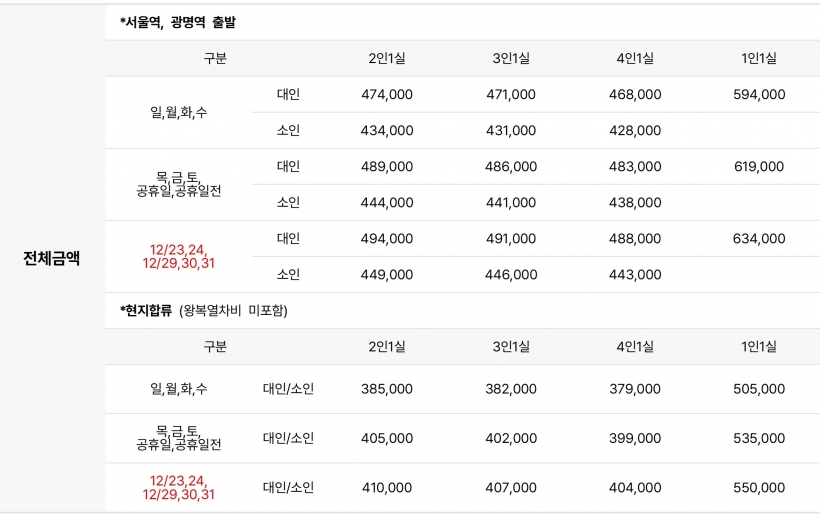 ※여행 중 제공되는 식사는 4인 기준으로 차려지며, 2인 또는 홀수 인원으로 예약 시 다른 일행과 함께 식사를 하오니 참고 바랍니다.