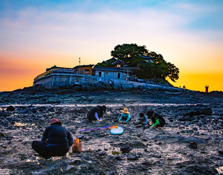 다른 암자와는 달리 간조시에는 육지와 연결되고 만조시는 섬이 되는 신비로운 암자로 만조시에는 물 위에 떠 있는 암자처럼 느껴진다. 주위 자연경관과 옛 선조들의 숨결을 함께 느낄 수 있는 고찰이 어우러져 관광객의 발길이 줄을 잇고 있다. 또한, 간월도에서 생산되는 굴의 풍년을 기원하는 굴부르기군왕제가 매년 정월 보름날 만조시에 간월도리 어리굴젓 기념탑 앞에 서 있는데, 이 행사는 부정한 행동을 하지 않은 청결한 아낙네들이 소복(흰옷)을 입고 마을 입구에서 춤을 추며 출발하여 굴탑 앞에 도착하면 제물을 차려 놓고 굴 풍년 기원제를 지내며 채취한 굴은 관광객에게 시식도 시켜준다. |
