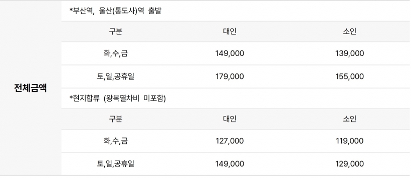| ·모이는 장소 | 개별탑승 (출발1~2일전 승차권/일정표 문자발송) |