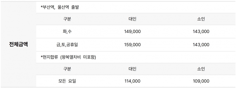 | ·모이는 장소 | 개별탑승 (출발1~2일전 승차권 /일정표 문자발송) |