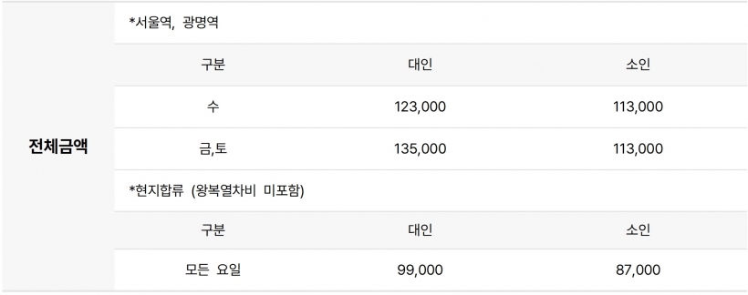 왕복 KTX 열차비, 연계차량비, 중식, 입장료, 인솔안내비 |