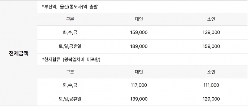 | ·모이는 장소 | 개별탑승 (출발1~2일전 승차권/일정표 문자발송) |