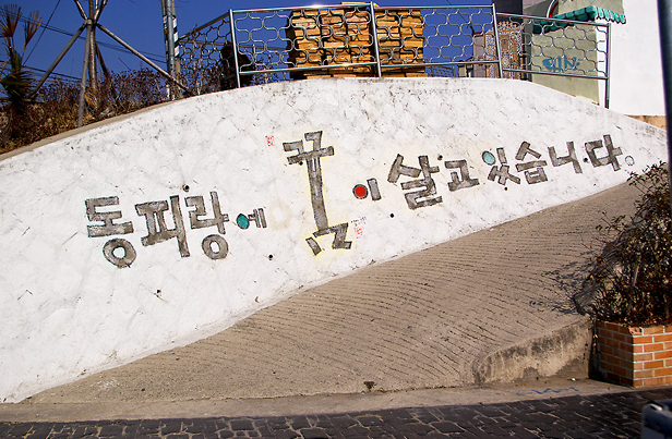 ‘동피랑’이라는 이름은 ‘동쪽’과 ‘비랑’이라는 말이 합쳐져서 생겼다. ‘비랑’은 ‘비탈’의 통영 사투리인데 그 앞에 ‘동쪽’을 나타내는 말 중 ‘동’만 떼어 붙인 것으로 그래서 사람들은 ‘동피랑’이라고 부르게 된 것이다. 푸른 통영 21 추진 협의회는 2007년 10월 전국적으로 동피랑길에 그림 그릴 사람들을 모았다. 그 사람들이 마을 담과 벽 길 등에 온통 그림을 그렸고 바닷가 언덕 마을이 그림으로 다시 태어난 것이다. 동피랑 골목길은 그 갈래가 수십 개다. 그 모든 골목에 그림이 있고 하늘과 맞닿은 마을, 그곳에 그려진 그림은 마을을 동화나라로 만들기에 충분하다. 또 마을에서 내려다보는 강구안 바다 풍경도 볼만하다.