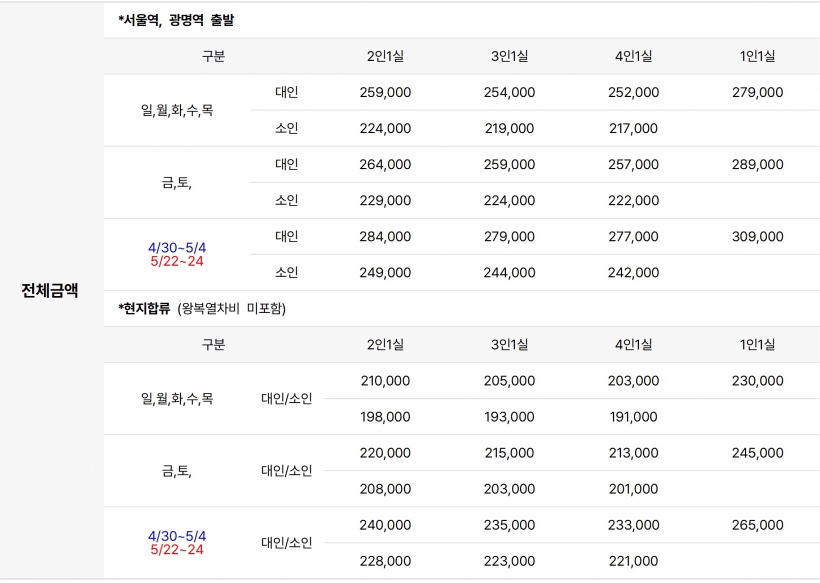 | ·모이는 장소 | 개별탑승 (출발1~2일전 승차권 /일정표 문자발송) |